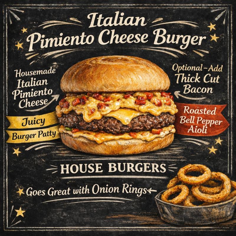 Hand Pattied Burger topped with our housemade Italian Pimiento cheese. Make it extra special by adding Bacon!