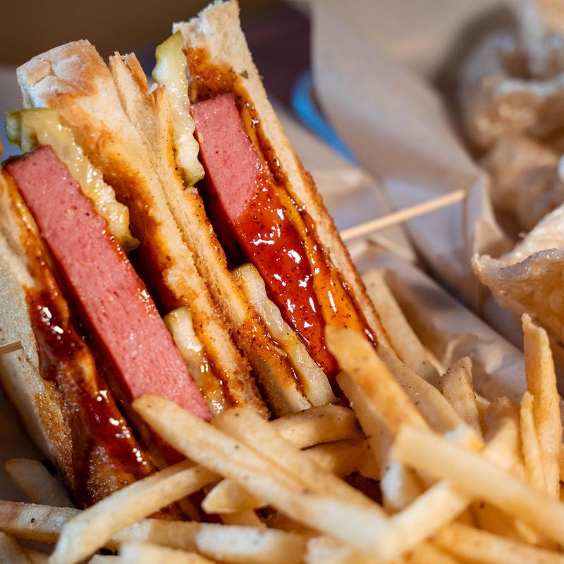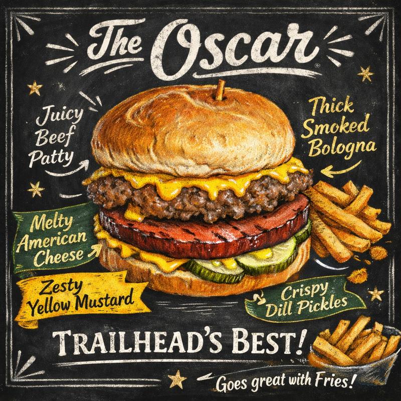 Hand pattied burger plus a 1/4 lb smoked Bologna with 2 pieces of American cheese, mustard, and pickles on a Kaiser bun. Not enough food for you? Just add Bacon!