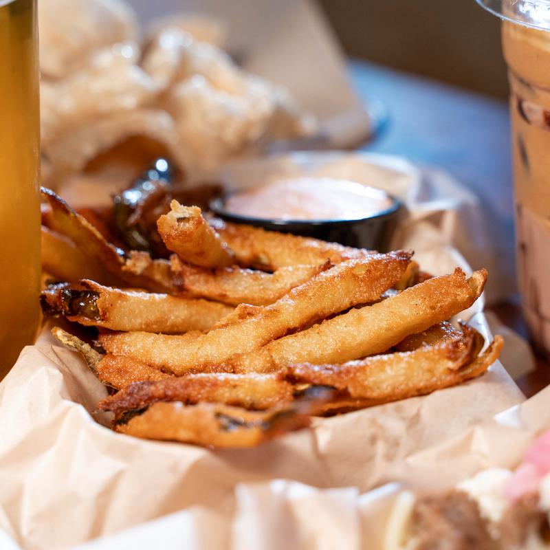 Crispy breaded & fries pickle strips.