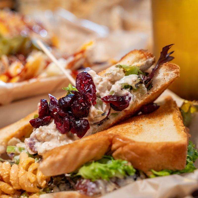 Grape-studded chicken salad mingles with celery, cranberries, mayo, breadcrumbs, and spring mix on wheat bread.