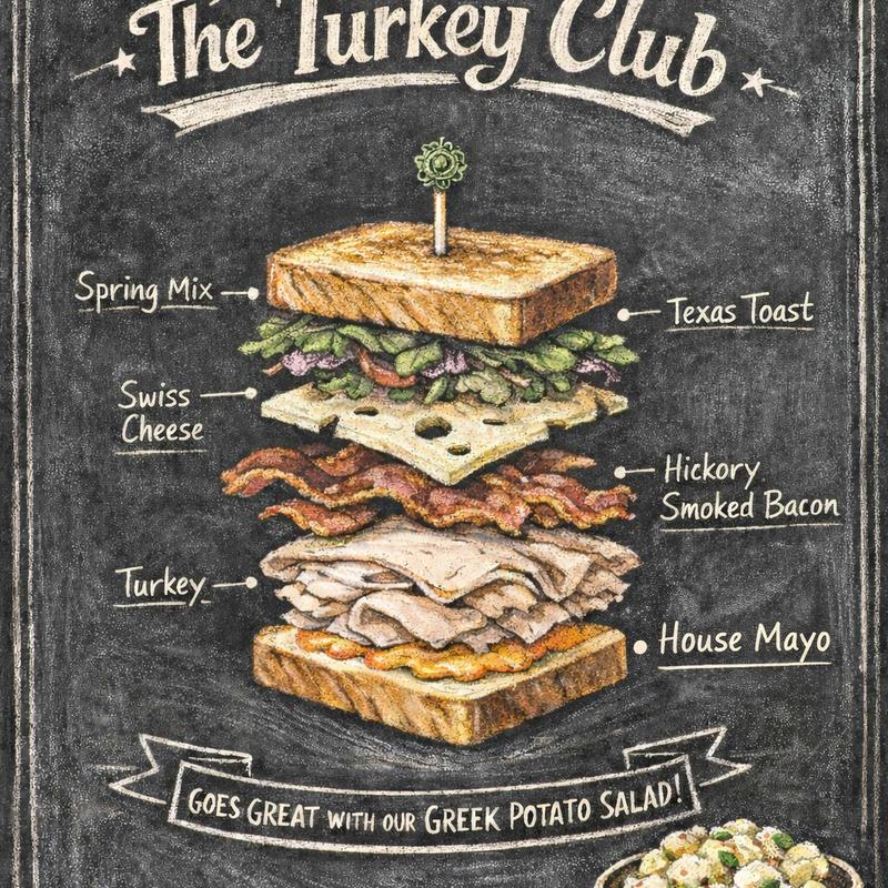 Sliced turkey, Swiss cheese, spring mix, bacon, and house mayo on grilled Texas toast.