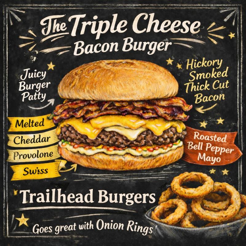 Hand pattied burger with bacon, cheddar, Swiss, & provolone plus our house mayo.
