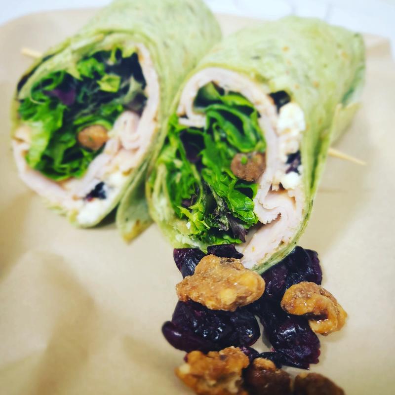 Turkey, mozzarella, fontina, spring mix, and Caesar dressing on a spinach herb wrap.
