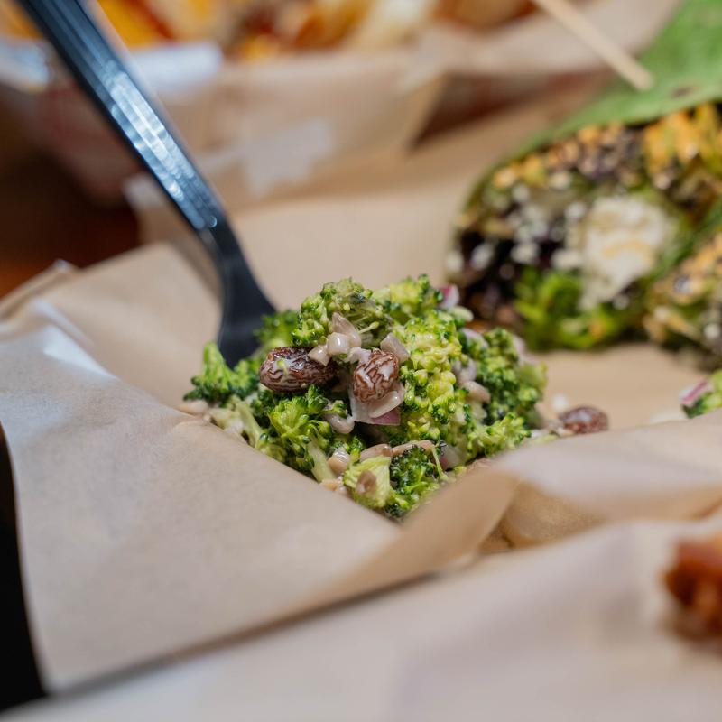 Fresh broccoli, raisins, red onions, and sunflower seeds in a sweet creamy Southern dressing.