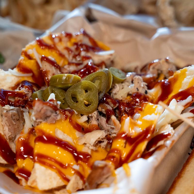 Tortilla chips topped with Rotel cheese dip, housemade taco beef, and shredded cheddar. Other toppings available for add-on.