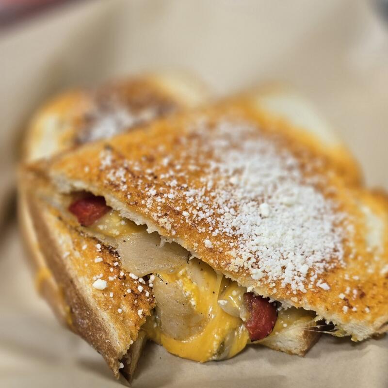 Cheesy mix of mascarpone, fontina, mozzarella, cheddar, and Jack with roasted red peppers, garlic, aioli, and spices on grilled Texas toast.